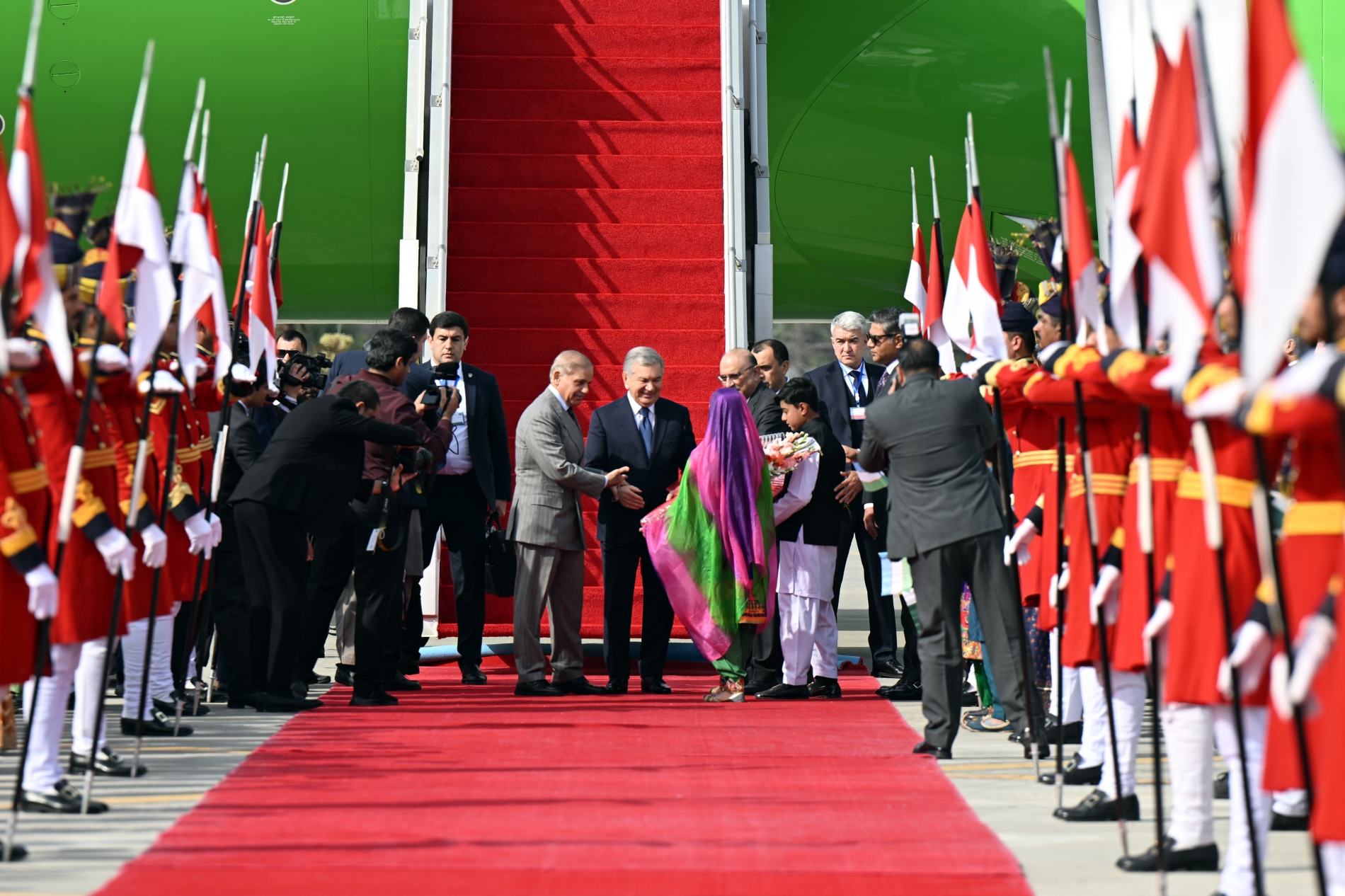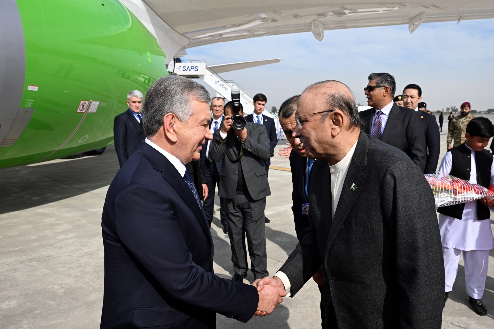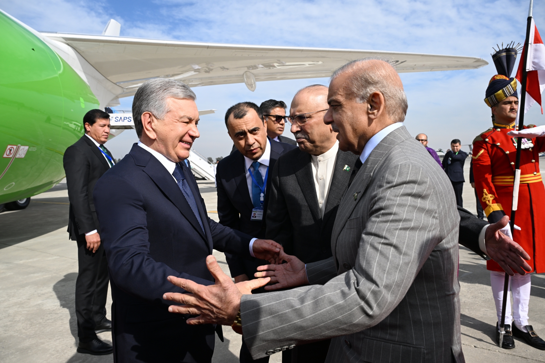 “Nurxon” aeroportida davlatimiz rahbarini Pokiston Prezidenti Asif Ali Zardoriy, Bosh vazir Shahboz Sharif va boshqa rasmiy shaxslar kutib oldi.
