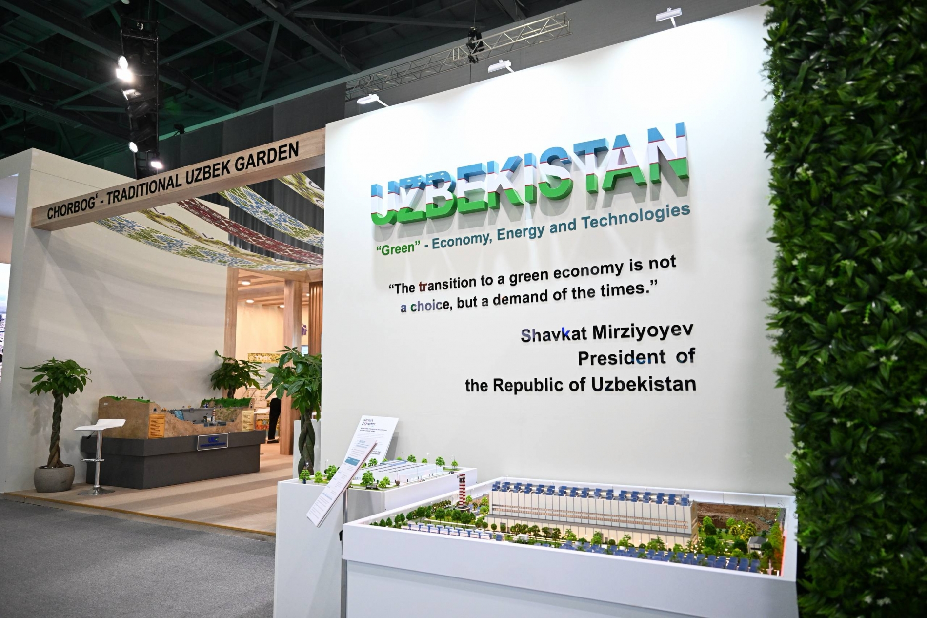 Oliy martabali mehmonlarga ekologik taraqqiyotning zamonaviy modelini shakllantirishga qaratilgan asosiy tashabbuslarni oʻz ichiga olgan ekspozitsiya taqdim etildi. “Chiqindisiz hudud”, “Toza havo”, “Yashil makon”, “Ekomadaniyat”, “Biomeros” va “Ekologik taʼlim” kabi umummilliy loyihalar shular jumlasidan.