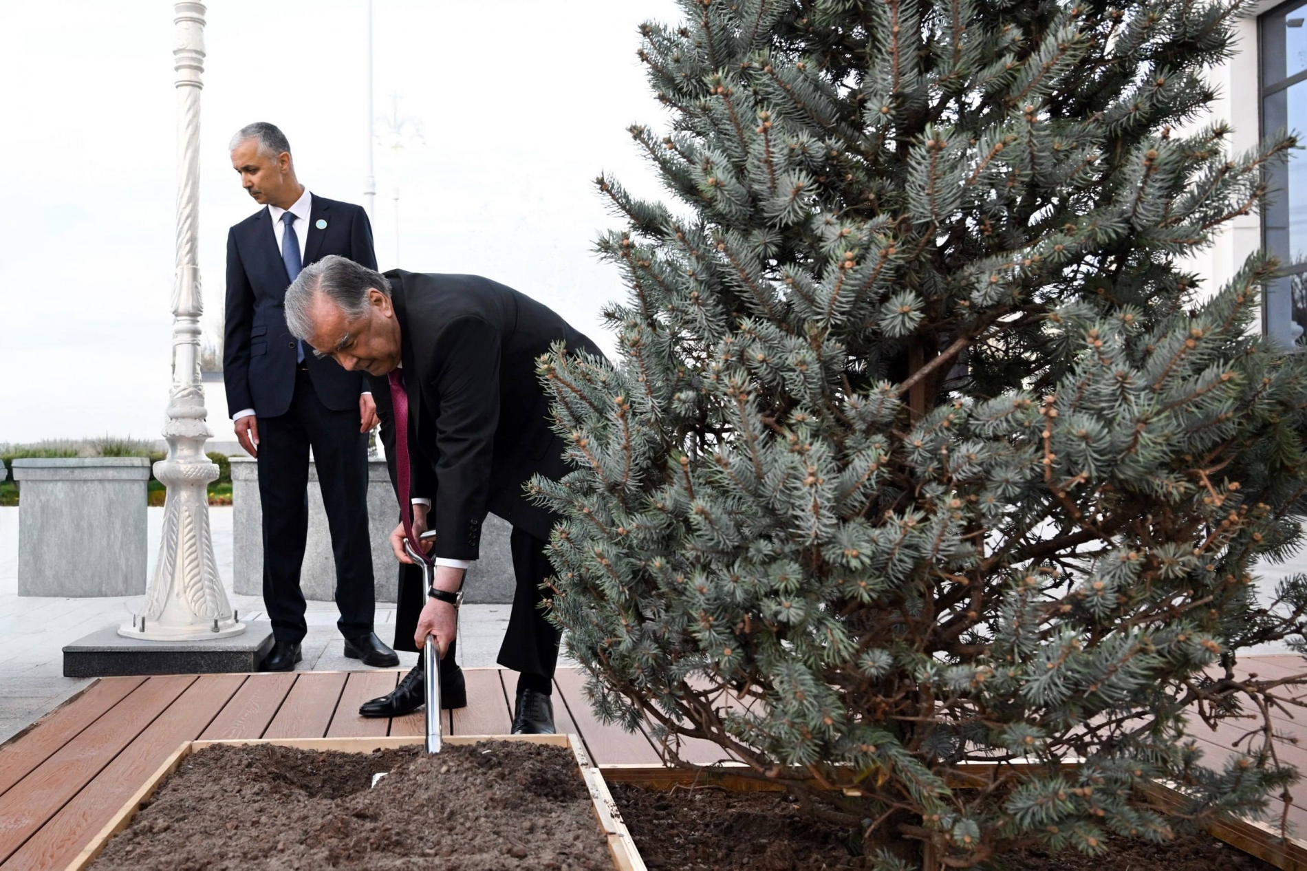 В завершение церемонии Президенты оставили памятные записи в Книге почетных гостей и посадили деревья на территории дипломатического представительства.