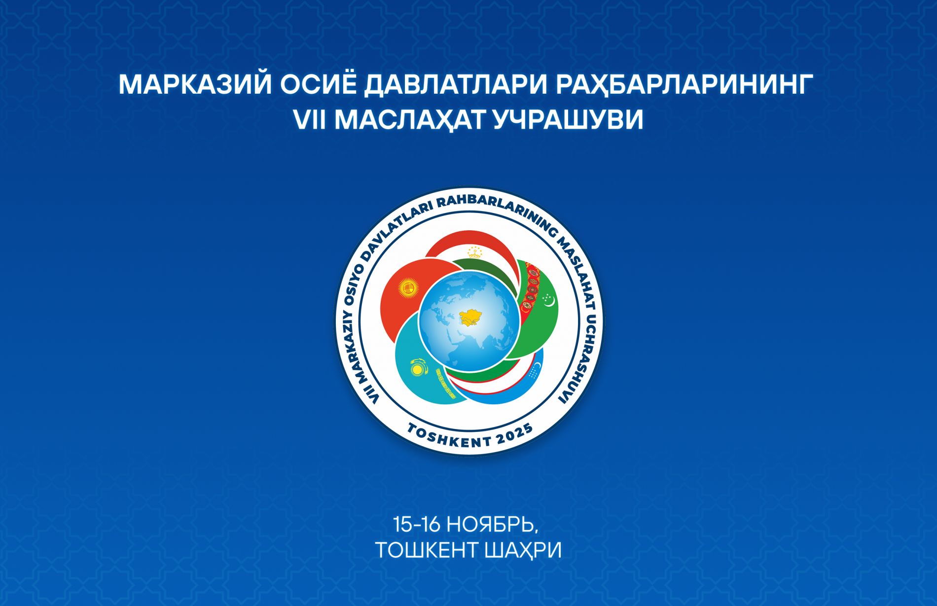 15-16 ноябрь кунлари Тошкент шаҳрида Ўзбекистон Республикаси Президенти Шавкат Мирзиёев раислигида Марказий Осиё давлатлари раҳбарларининг еттинчи Маслаҳат учрашуви бўлиб ўтади.